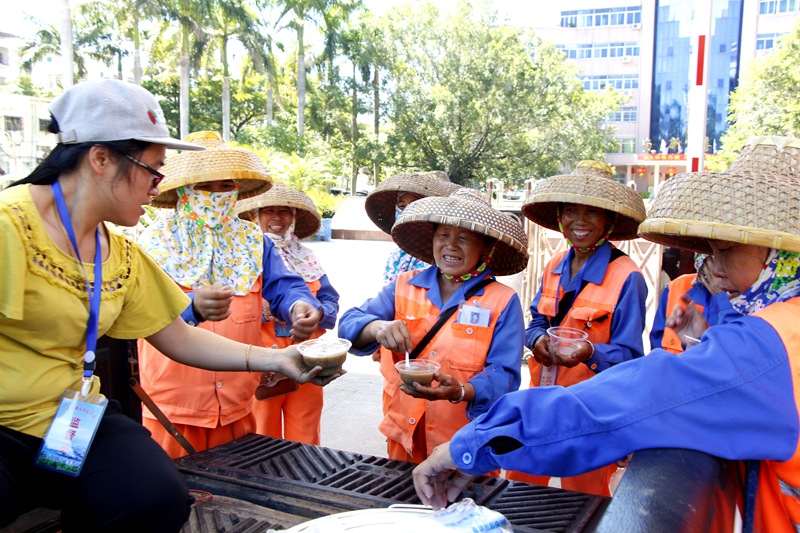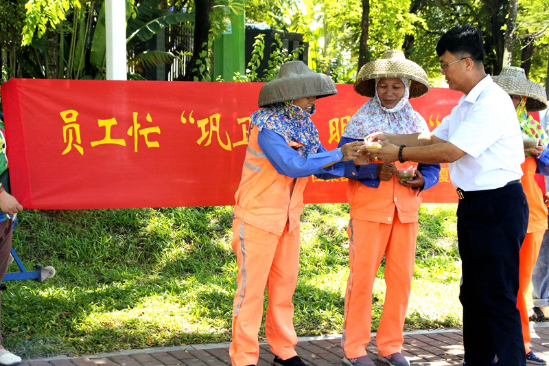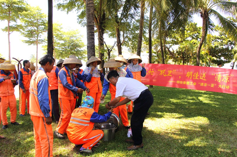 7月3日,集團公司主席工會主席高斐斐率慰問組一行,到鳳凰路一中路段、海虹廣場等地為正在高溫下作業(yè)的員工送去降溫解暑的綠豆湯,送上公司以及工會組織的關(guān)懷和問候。