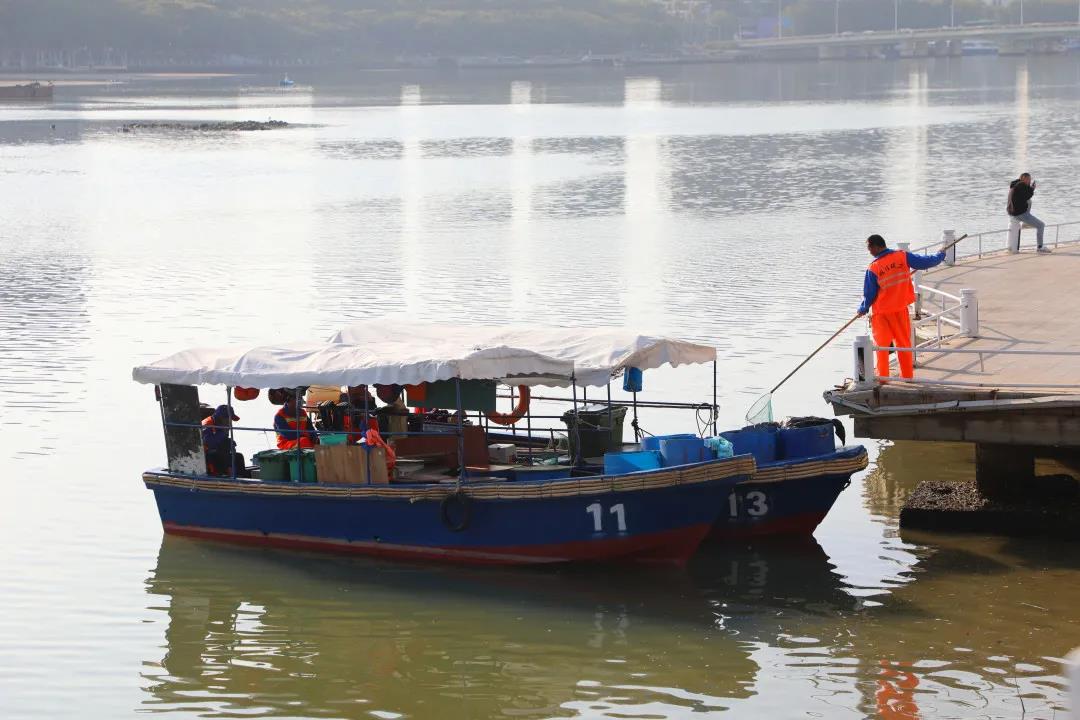 每天工作都是從早上7點(diǎn)鐘到下午的6點(diǎn)半,我們是分段來(lái)的。主要是坐船去收集河上的一些垃圾,一天巡邏清掃一次,清掃完了回來(lái)再巡邏保潔。水面和紅樹林里的垃圾都要清理。下雨天我們也要出來(lái)(工作),臺(tái)風(fēng)天就要做好防風(fēng)的工作,如果是下雨,我們一樣要出來(lái)打撈垃圾。
