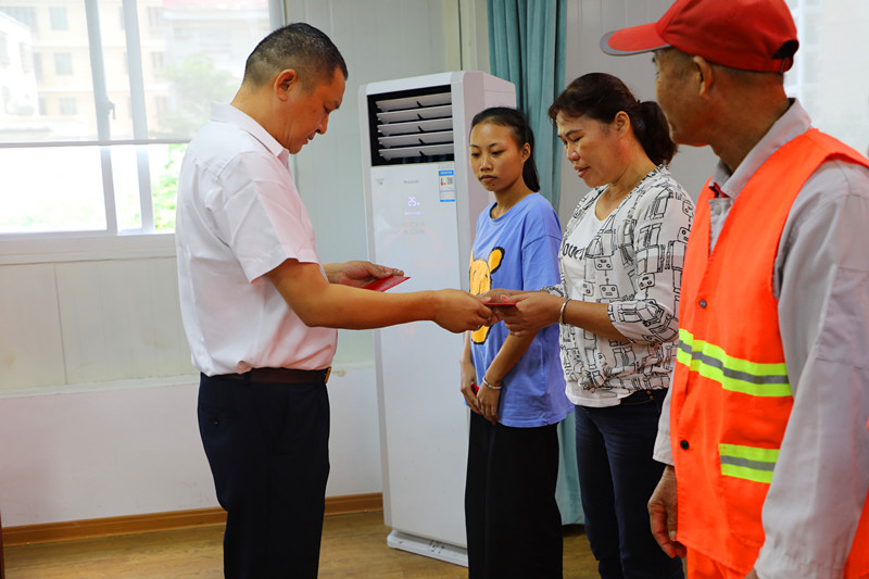 (生產部經理楊洪向學生家長發(fā)放助學金)